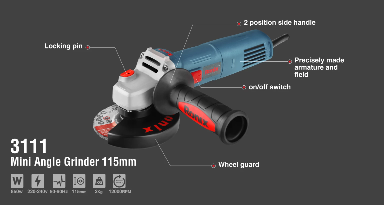 Amoladora angular 115mm Potencia: 850 W Velocidad sin carga: 12000 rpm Peso: 2 kilos