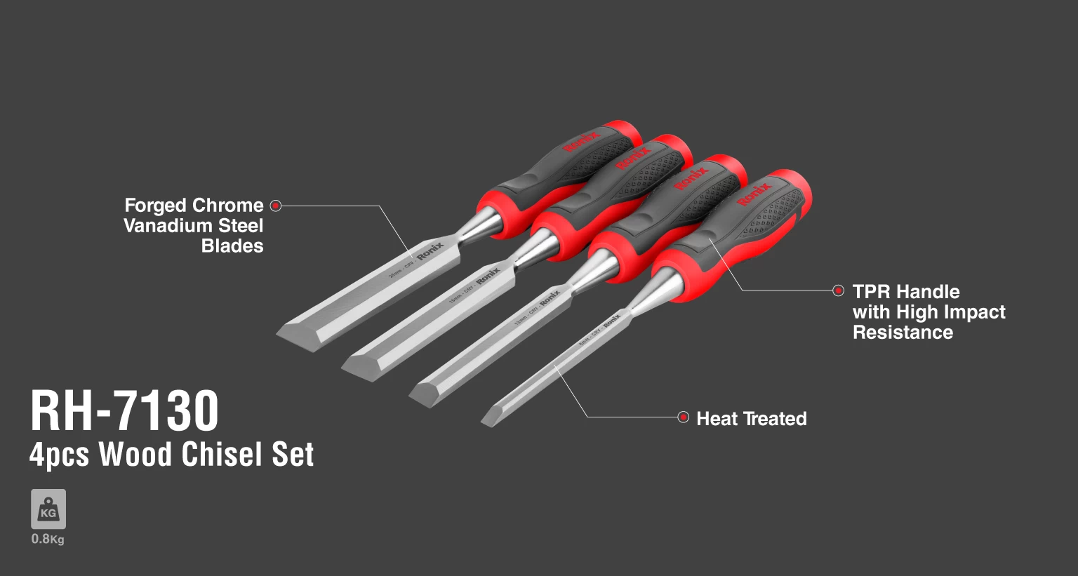 Juego de cinceles para madera (4 piezas) Material del mangoTPR Material del cuerpo60 CRV tamaño6/12/19/25 mm Número de piezas del producto4 piezas Peso0,8 kg/juego Suministrado entarjeta blíster