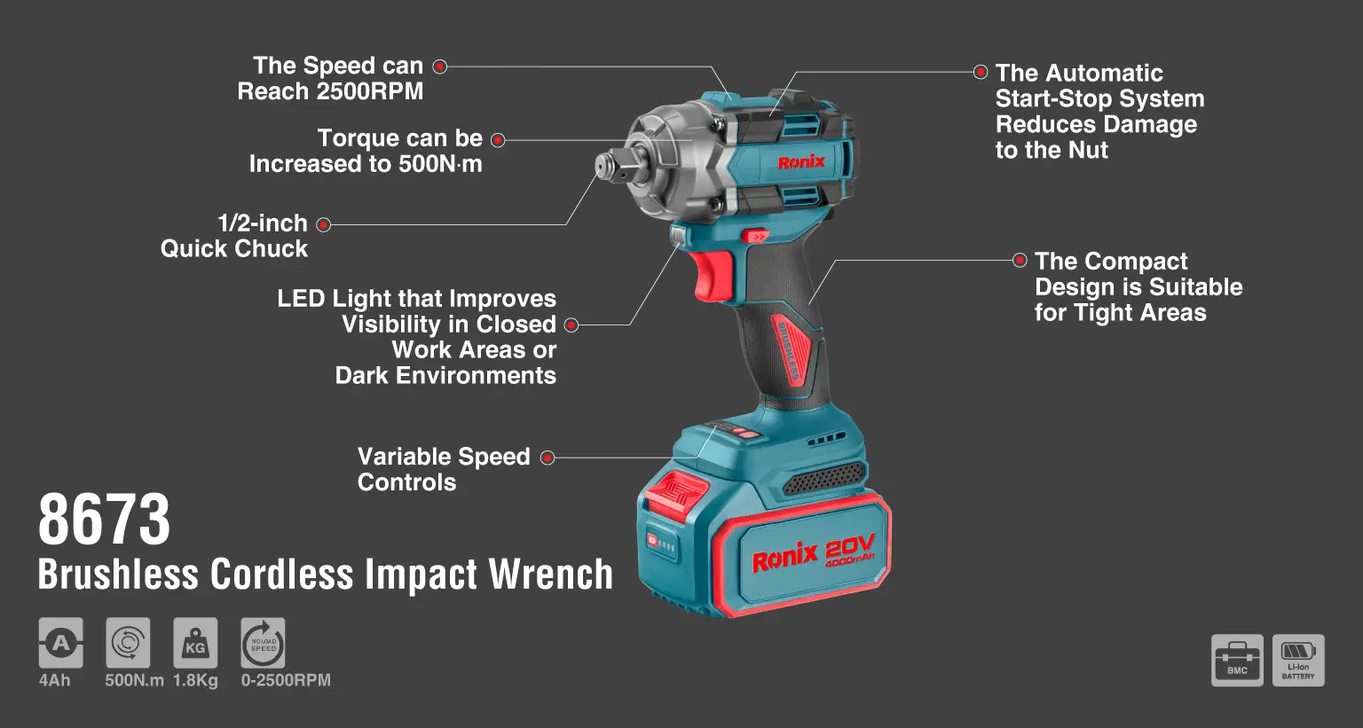 Llave de impacto inalambrica 20V 500 NM Brushless Tipo de batería Iones de litio Capacidad de la batería 4,0 Ah/20 V Estilo de cabeza Cuadrado Dimensiones 138*70*200,5 milímetros Peso 1,8 kg (con 1 batería) embalaje BMC Incluye: 2 baterías, 1 cargador, 1 funda de 22 mm de diámetro, 1 anillo de goma y 1 pasador cilíndrico para