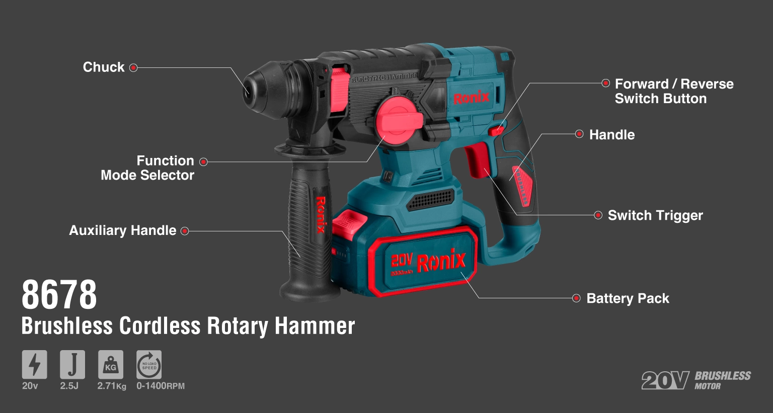 Rotomartillo Inalambrico 20V SDS Plus 2.5 Joules Brushless Tipo de batería: Iones de litio Capacidad de la batería: 4,0 Ah Tipo de mandril: SDS-plus Tamaño del mandril: G 10 mm Velocidad sin carga: 0-1400 RPM Incluye 2 baterías de 4,0 Ah + cargador rápido de 1 hora con base (22V 2.2A). Incluye caja para transportar (BMC)