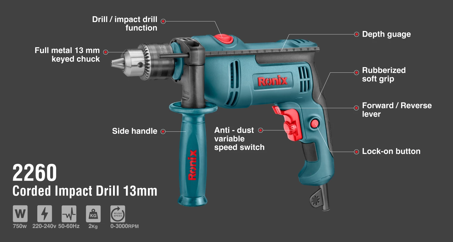 Funciona con voltaje de 220–240V, tiene un diseño liviano de solo 2 kg para un manejo cómodo y un mandril de 13 mm compatible con una amplia variedad de mechas. Incluye caja de transporte BMC, ideal para proteger la herramienta y facilitar su traslado.