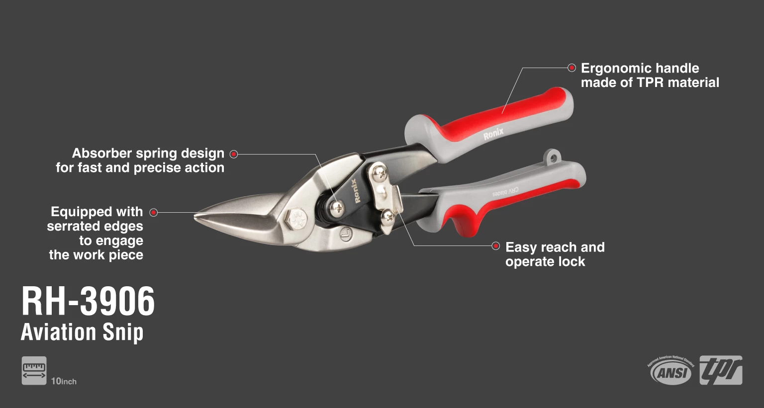 Tijera de Aviacion Corta Chapa corte Izquierdo Cumple o supera las especificaciones ANS I. Hojas dentadas y duraderas de acero de aleación CRV. Corta acero laminado en frío de hasta 1,2 mm.